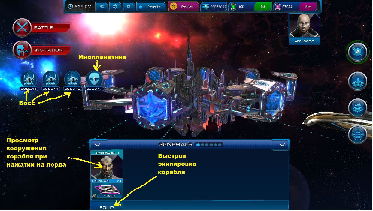 Точно таким же образом мы покупаем ракеты, лазеры, офицеров, руны и артефакты в магазине и загружаем их на корабль. Думаю это не составит Вам труда. Так же добавлю, что с увеличением уровня корабля, меняется вид корабля.