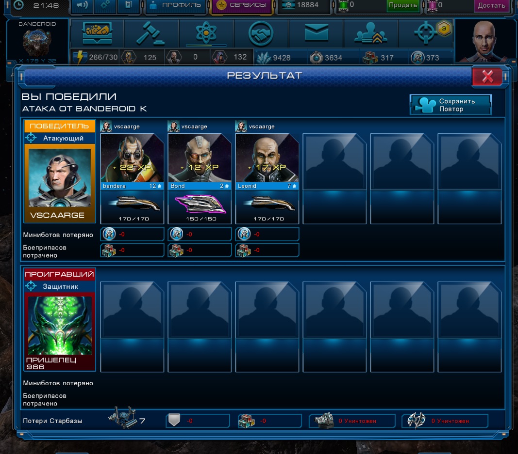 negadiaj писал(а):Такая же ситуация, отправил вчера генерала на грабеж, вернулся с поражением, правда миниботы все потерял, посмотрел запись боя - мой генерал танцевал польку бабочку вокруг базы пришельцев и ждал, когда же его наконец убьют)))) При этом стрелять ему видимо религия не позволяла - не сделал ни одного выстрелаПочему я не мог управлять боем и собственно - почему генерал не использовал лазеры и ракеты?